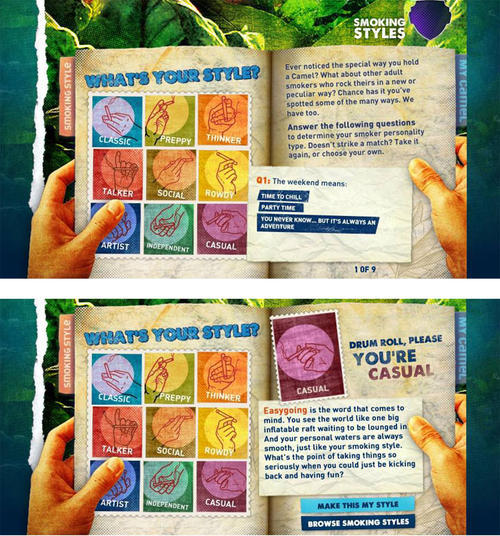 Web pages recorded in September 2011 from a feature on Camel's brand website, Camel.com. The feature invites smokers to take a short "quiz" of 9 questions to determine their "smoker personality type", their "smoking style". According to the feature, different smoking styles/personality types include: classic, preppy, thinker, talker, social, rowdy, artist, independent, and casual.