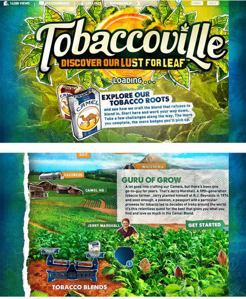 Web pages recorded in September 2011 from a feature on Camel's brand website, Camel.com, called "Tobaccoville". The feature invites visitors to click on various included links to learn about where Camel's tobacco products come from and how they are created.