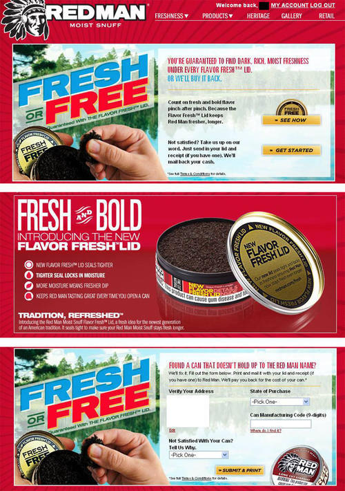 Web pages recorded in September 2011 from Red Man snuff tobacco's website (www.redman.com)in promotion of the brand's "freshness". The feature promotes the brand's "flavor fresh lid", which the brand guarantees to provide product freshness. A "Fresh or Free" guarantee allows users unsatisfied with the product a place to fill out a request for a refund.