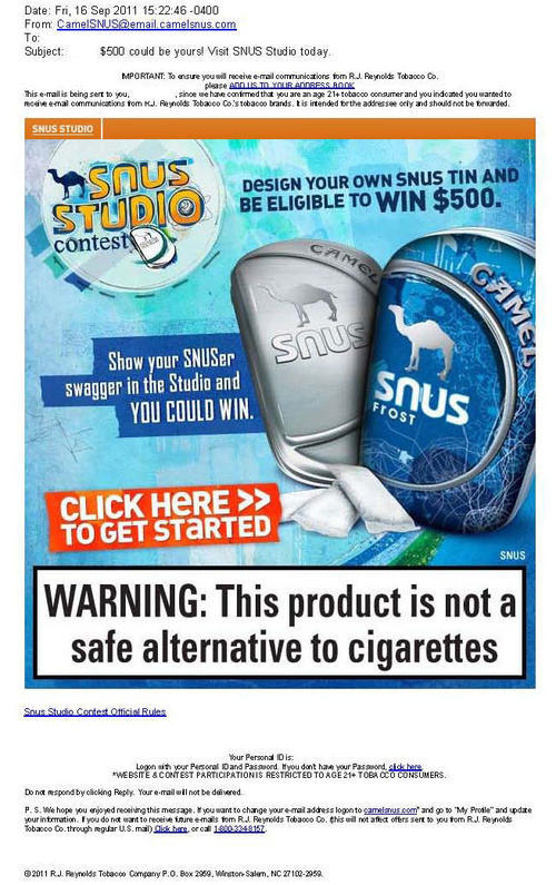 Email received in September 2011 in promotion a new interactive feature found on the Camel Snus website - the Camel Snus Studio Contest. With this feature, site visitors can create and submit new Camel Snus tin designs. Users can submit a new design in each of three rounds and vote for their favorite styles; winners of each round win $500. The same feature is also available from Camel's main website, www.camel.com.