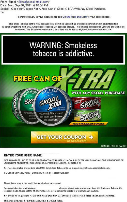 Email sent in late September 2011 promoting an offer for a free can of Skoal X-tra with any Skoal purchase. The e-mail includes a link to the brand's website to obtain the offered promotional coupon.