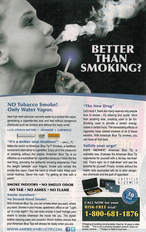 Magazine advertisement for American Blue Tip electronic cigarettes (or "e-cigarettes")advertising the product as a healthier, more convenient and socially acceptable alternative to smoking. "Better than smoking? No tobacco smoke! Only water vapor."