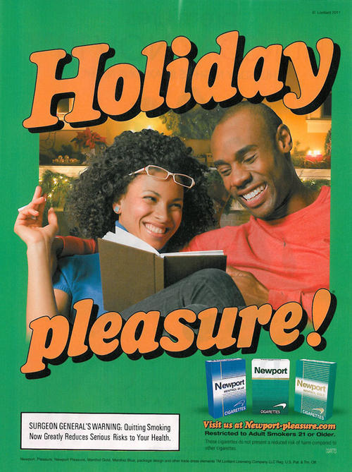 Christmas holiday themed ad for Newport cigarettes featuring an image of an African American couple reading and laughing. "Holiday Pleasure!"