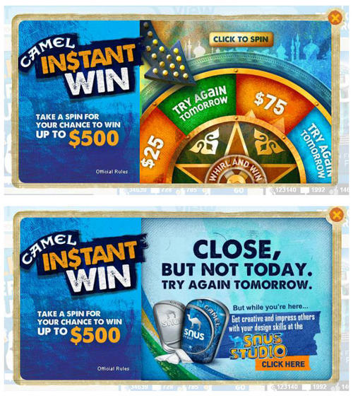 Images captured from Camel.com in October 2011, highlighting a new "Instant Win" feature added to the Camel brand website. The feature allows site users to spin a virtual "wheel" for a chance to win daily instant prizes up to $500.