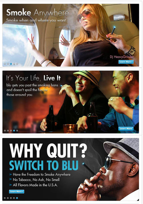 Series of advertising images in promotion of Blu electronic cigarettes, captured from the brand's website (www.blucigs.com) in October 2011. Text: "Smoke Anywhere", "It's Your Life, Live it", "Why Quit? Switch to Blu".