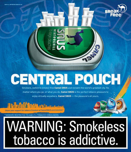Ad directed at New York City smokers, encouraging them to switch to Camel Snus as a way to cope with NYC's smoking bans, including the expansion to outdoor public places such as parks (enacted May 23, 2011). The ad features the words "Central Pouch", a reference to NYC's Central Park.