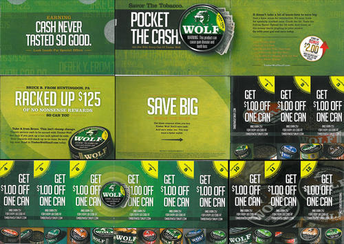 Direct mail from Timber Wolf promoting the brand's cash back program (where users can earn 25 cents back for each can purchased) and providing a total of 12 Timber Wolf coupons. Text: "Earning cash never tasted so good." "Save big while your earn." "Use these coupons when you buy Timber Wolf. You'll save cash. And ear some, too. You may want a fatter wallet."