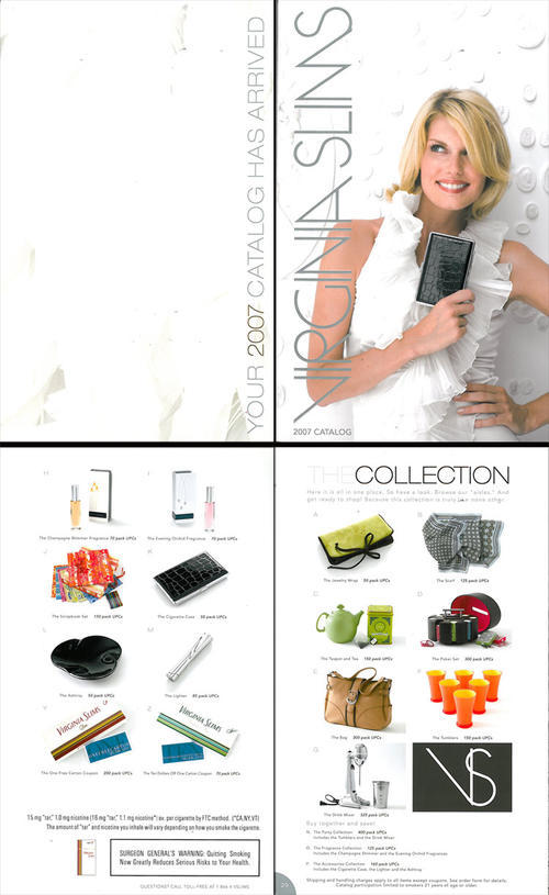 2007 Virginia Slims Catalog sent by direct mail to smokers on the brand's mailing list. The catalog includes items smokers can order in exchange for various quantities of Virginia Slims pack UPCs.