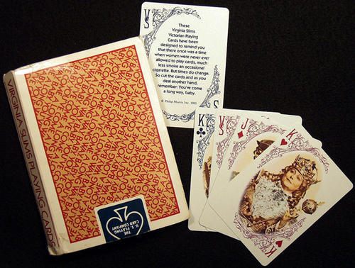 Virginia Slims playing cards, red print on gold background.