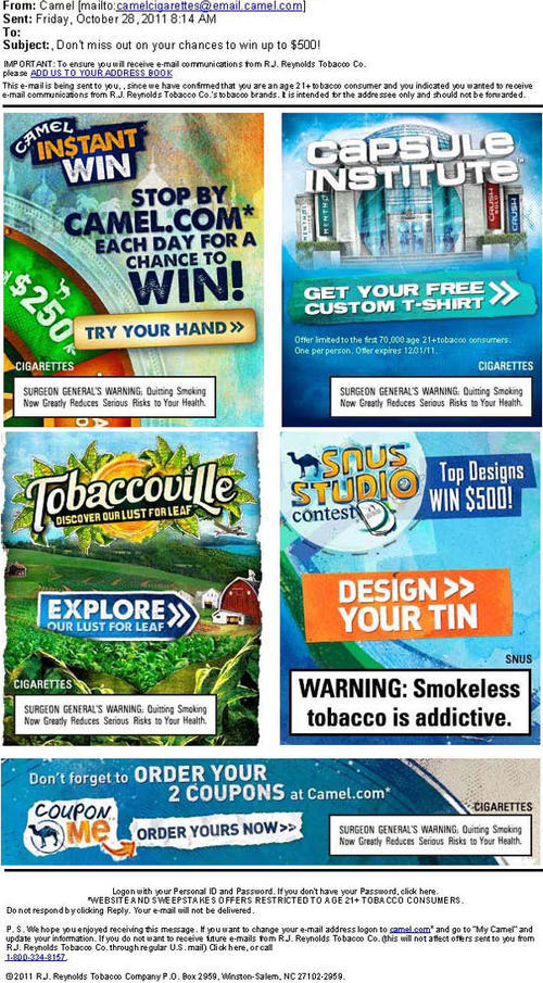Email from Camel sent in November 2011 promoting a new Instant Win feature added to the brand's website. Visitors can enter every day for chances to win small cash prizes. The email also promotes other features present on the website including the Capsule Institute (and its free t-shirt gift offer), Tobaccoville, the Snus Studio Contest and the Coupon Me program.