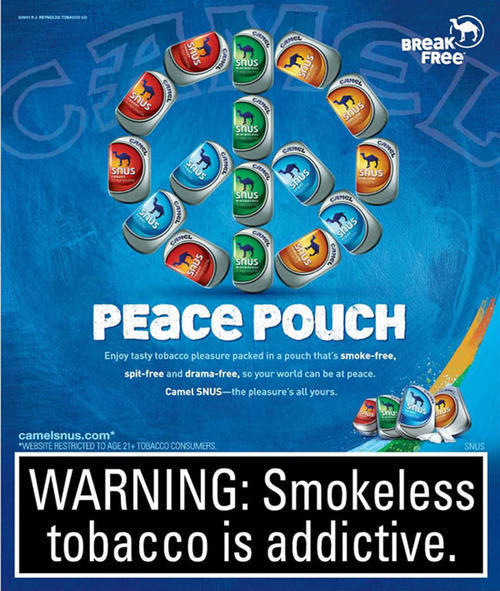 Ad for Camel Snus, featuring an image of Camel Snus tins arranged in the shape of a peace sign.