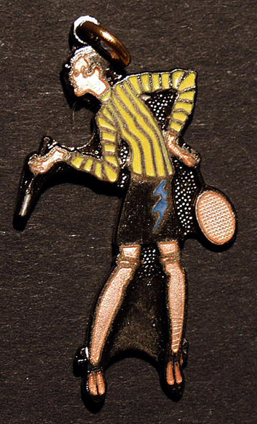 \"Virginia Slims Invitational tennis\" engraved on back of small metal keychain shaped like a woman holding tennis racket and cigarette.