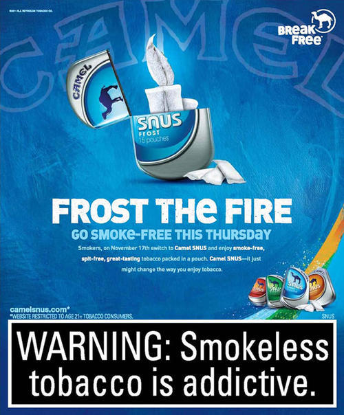 Camel Snus ad encouraging smokers to switch to Camel Snus on November 17, 2011, the date coinciding with the Great American Smokeout. Text: "Frost the Fire. Go smoke-free this Thursday".