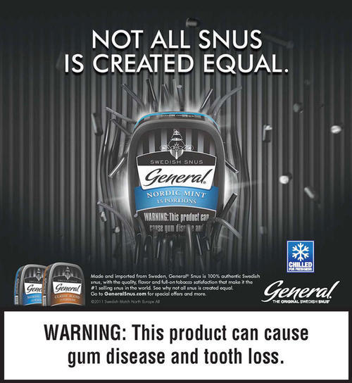 Ad in promotion of General Snus, featuring an image of two product styles. Text: Not all snus is created equal. Made and imported from Sweden, General Snus is 100% authentic Swedish snus, with the quality, flavor and full-on tobacco satisfaction that make it the #1 selling snus in the world. See why not all snus is created equal. Go to GeneralSnus.com for special offers and more."