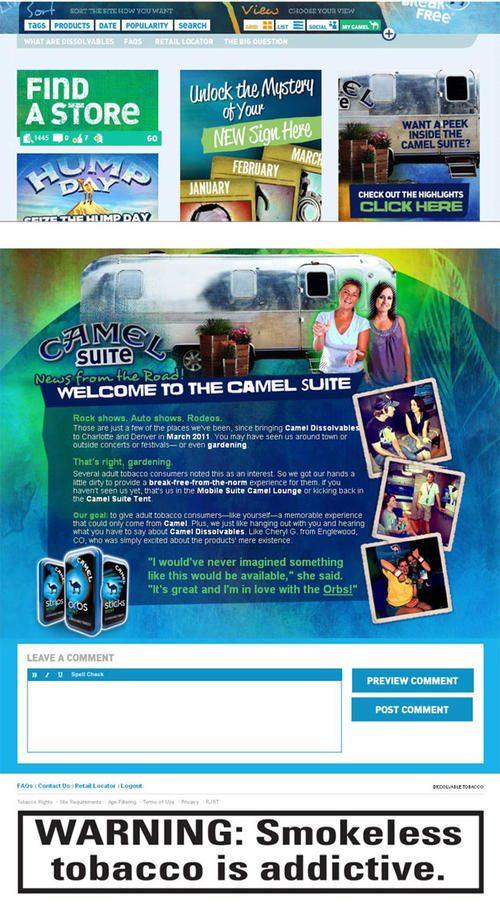 Web pages recorded from Camel Dissolvable's website in November 2011 highlighting a newly added feature - The Camel Suite. The feature describes the brand's use of a Mobile Suite Camel Lounge or a Camel Suite Tent outside of various events in and around Charlotte and Denver such as concerts, festivals, rodeos, and auto shows in promotion of Camel Dissolvables.