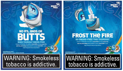 Two Camel Snus ads encouraging smokers to switch to Camel Snus on November 17, 2011, the date coinciding with the Great American Smokeout.