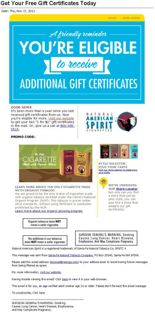 Email from Natural American Spirit received in late November 2011, reminding the receiver that they are eligible to request a new round of brand "gift certificates" (i.e., tobacco coupons). The offer is for two "1 for $1 coupons" good towards any brand pack or pouch purchase.
