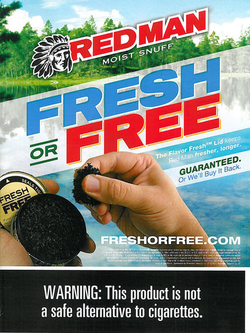 Magazine ad for Red Man snuff in promotion of the brand's "freshness" and its "flavor fresh lid". A "Fresh or Free" website and guarantee invites users unsatisfied with the product to fill out a request for a refund.