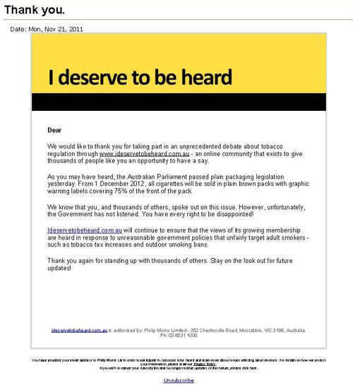 Australian based email sent from Philip Morris in November 2011 thanking the receiver for using the "I deserve" campaign website to make their voices heard regarding tobacco regulation issues. The email also informs that legislation to sell cigarettes in plain packaging had been passed.