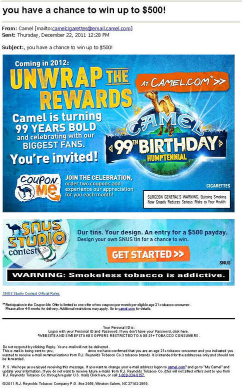 Camel email sent in late December 2011 announcing the coming of a new sweepstakes in 2012, the Camel "99th Birthday Humptennial". Text: "Camel is turning 99 years bold and celebrating with our biggest fans. You're invited!"