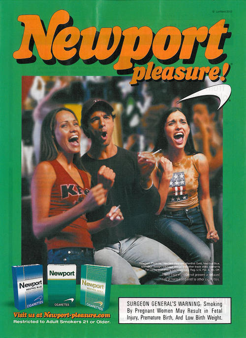 Newport ad featuring an image of three young adults smoking, laughing and cheering.
