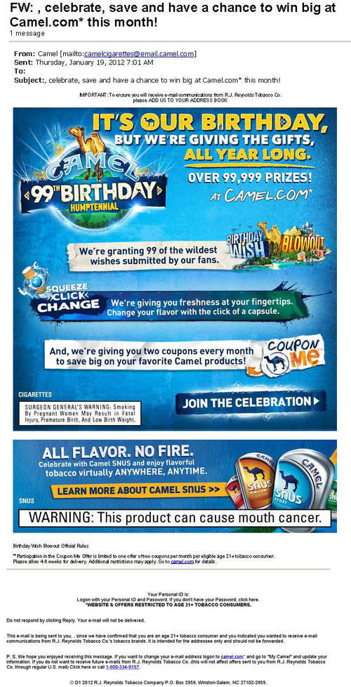 Camel email sent in January 2012 advertising Camel's birthday themed promotion, the "99th Birthday Humptennial". Text: "It's our birthday, but we're giving the gifts, all year long. Over 99,999 prizes!" The email directs receivers to visit the brand's website, Camel.com, to check out the first feature of the year long celebration - the "Birthday Wish Blowout". The email also encourages receivers to learn more about Camel Snus.