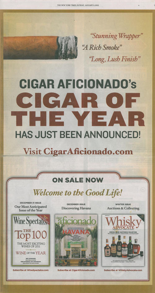 Full page ad in promotion of Cigar Aficionado's website and the magazine's "reveal" of its top rated cigar of 2011.