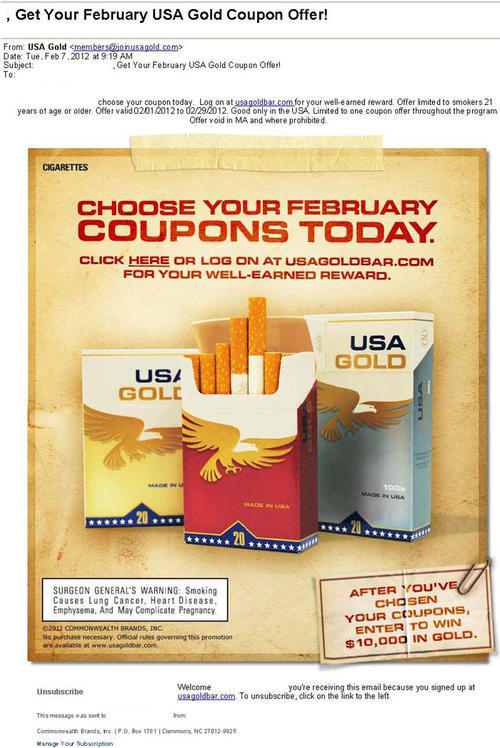Email from USA Gold directing the receiver to the brand's website for coupons offered for the month of February 2012. The email also reminds receivers to enter the brand's "gold" themed sweepstakes.