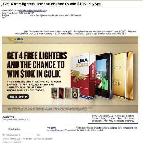 Email from USA Gold sent in February 2012 reminding the receiver about the "Win Gold with USA Gold Photo Challenge". The Challenge asks smokers to submit a picture of themselves with a USA Gold pack. Owners of the top 10 pictures with the most votes at the end of each of four voting periods will win a bar of gold or $10,000. Participants can vote daily for their own picture and lobby their friends to vote for them as well. The email also promotes a free "rewards" gift of four free lighters.