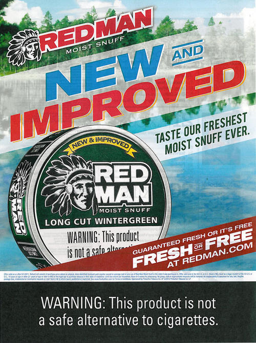 Magazine ad for Red Man snuff in promotion of the brand's "new and improved" wintergreen style, "guaranteed fresh". A "Fresh or Free" website and guarantee invites users unsatisfied with the product to fill out a request for a refund.