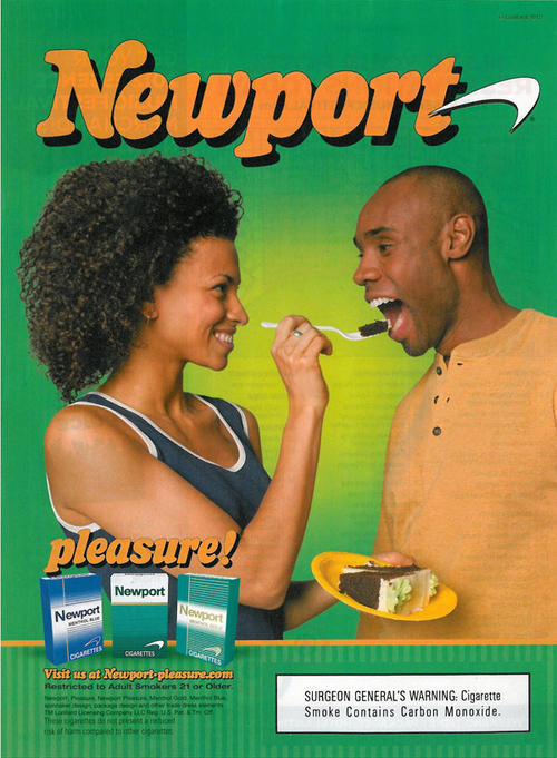 Newport ad featuring an image of an African American couple, with the woman smiling and feeding her partner a piece of cake. "Pleasure!"