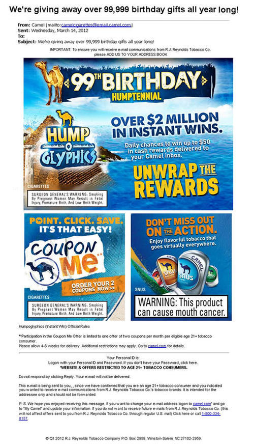 Camel email sent in March 2012 advertising Camel's birthday themed sweepstakes promotion, the "99th Birthday Humptennial". The promotion includes new monthly features such as the Camel "Hump O Glypics". Text: "Over $2 million instant wins. Daily chances to win up to $50 in cash rewards delivered to your Camel inbox. Unwrap the rewards".