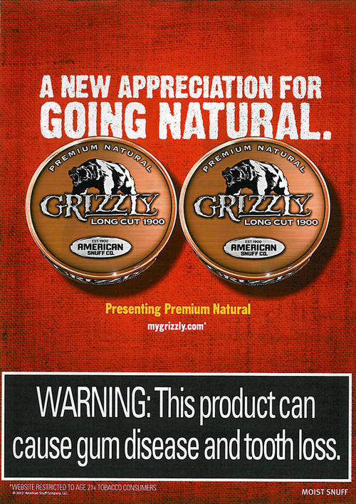 Ad in promotion of Grizzly snuff introducing new product styles - "A new appreciation for going natural. Presenting Premium Natural."