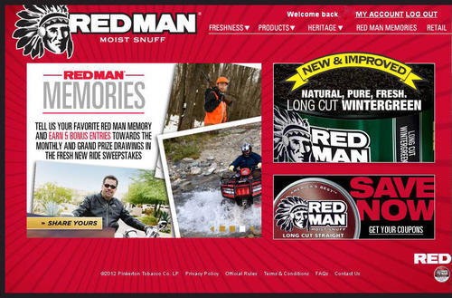 Web page recorded from Red Man's website (redman.com) in March 2012 showing a new “memories” feature which invites users to share a favorite Red Man product picture or memory to earn 5 bonus entries in the concurrent "Fresh New Ride" sweepstakes.