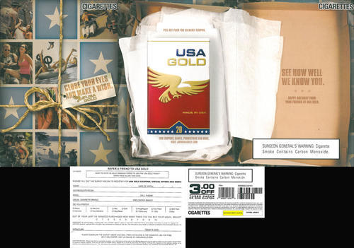Birthday themed direct mailing from USA Gold, including a coupon for $3.00 of three packs or one carton. "Happy birthday from your friends at USA Gold." The mailing also encourages the receiver to visit the brand's website and includes a sign up form to pass to a friend.