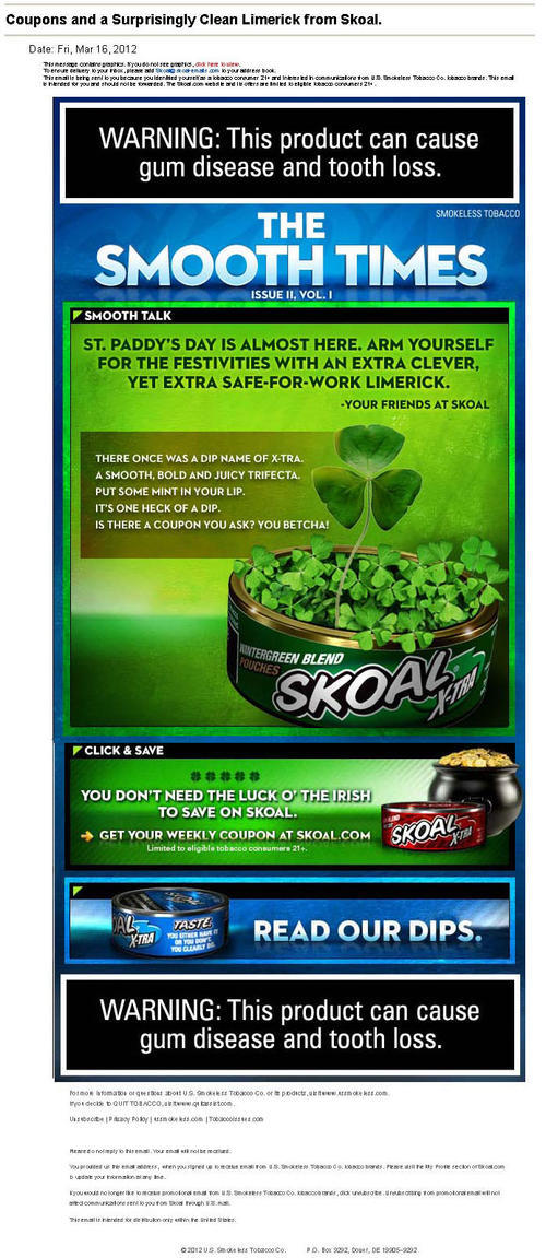 Email from Skoal sent in March 2012 as an issue of "The Smooth Times", Skoal's electronic newsletter. The email contains a St. Patrick's Day holiday themed limerick and an offer for Skoal coupons.