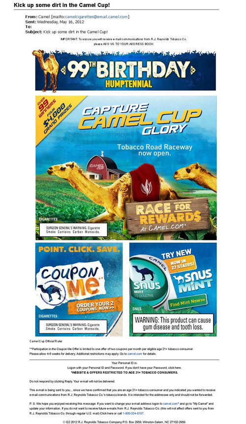 Email from Camel sent in May 2012 advertising a new feature of the 99th Birthday Humptennial promotion - the Camel Cup. The email also introduces a new style/flavor of Camel Snus - mint/peppermint.