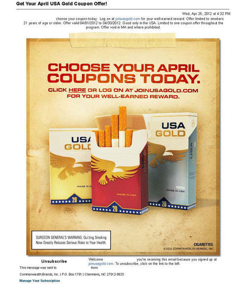 Email from USA Gold directing the receiver to the brand's website for coupons offered for the month of April 2012.