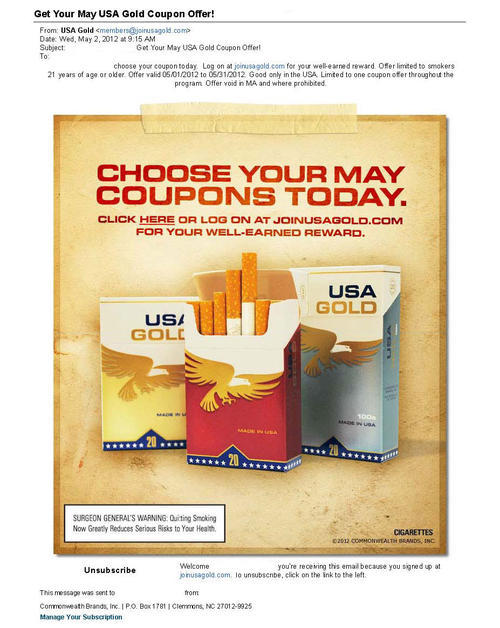 Email from USA Gold directing the receiver to the brand's website for coupons offered for the month of May 2012.