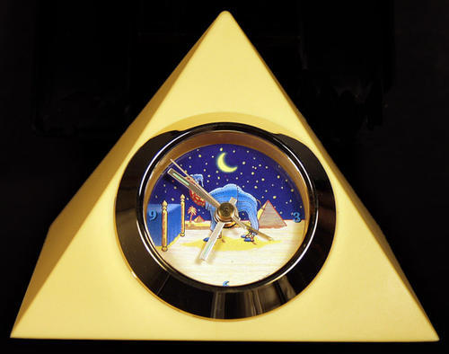 Clock in shape of yellow pyramid - scene on face of clock is nigh - moon, stars, Camel in pajamas.
