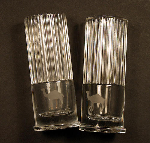 Tall thin shot glasses with Houston, Texas shooters engraved on base plus Camel logo pictured on side.