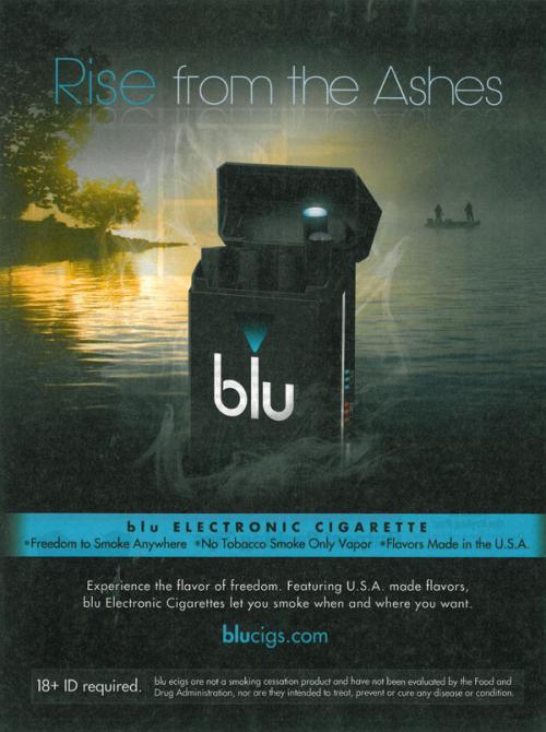 "Rise from the ashes." "Experience the flavor of freedom." "Featuring U.S.A. made flavors." "Blu Electronic Cigarettes let you smoke when and