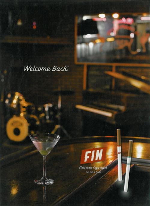 Ad promoting Fin electronic cigarettes (also known as e-cigarettes). Ad features an image of a martini in a bar setting, with product images on the side. Text: "Welcome back."