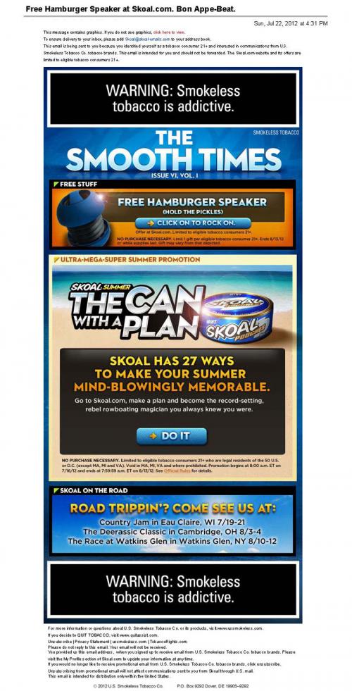 Email from Skoal sent in July 2012 as an issue of "The Smooth Times", Skoal's electronic newsletter. The email contains an offer for a free hamburger speaker to be redeemed online. It also promotes Skoal's new summer instant win game, "The Can With a Plan." Participants can enter daily for gift card prizes. The email invites the receiver to visit Skoal featured events at various locations.