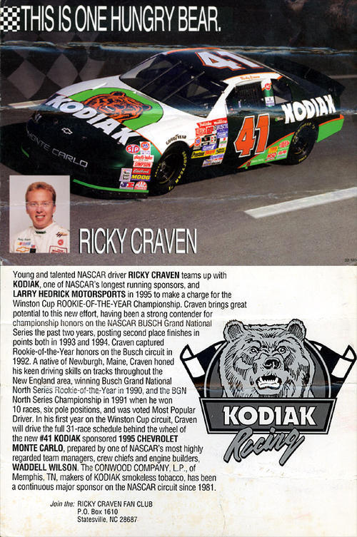 Cardboard with race car on front and picture of Ricky Craven - Race car says "This is one hungry bear." Back has description and bear with "Kodiak Racing" written beneath bear.