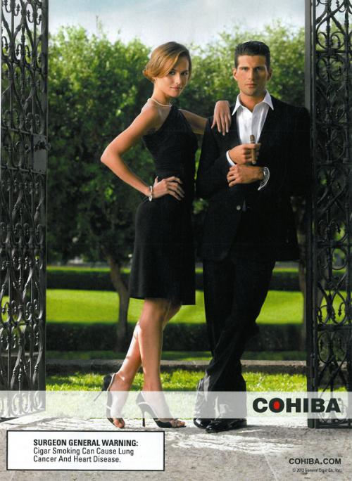 Magazine ad promoting Cohiba cigars. The image features a woman leaning on a man who is holding a cigar. Both are well dressed. The ad seems to associate cigar smoking with wealth and luxury.