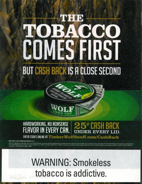 Timber Wolf ad offering consumers 25 cents cash back on each can as part of their No Nonsense Rewards program. Codes, found under each lid, were to be entered online and participants were to be mailed a check (up to $125) at the end of one year of participation. However, the FDA declared the promotion in violation of the Tobacco Control Act and so the promotion was discontinued.