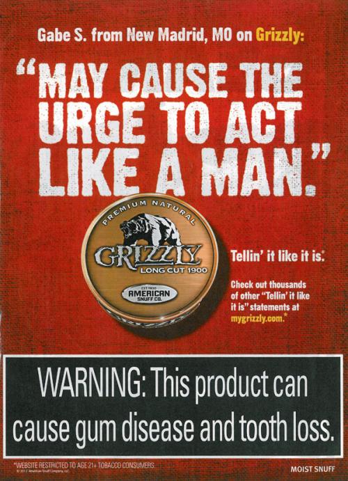 Ad in promotion of the Long Cut 1900 product style. The message was one of the winners of the "Tellin' it like it is challenge."  Text:"May cause the urge to act like a man."