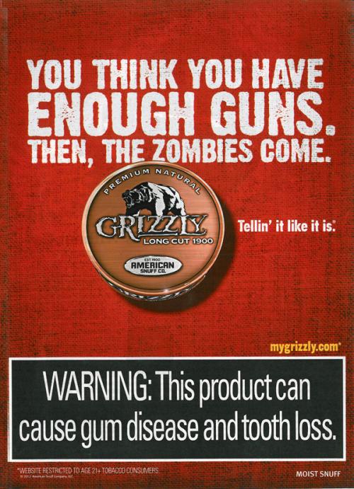 Cut 1900 product style. Text:"You think you have enough guns. Then, the zombies come."