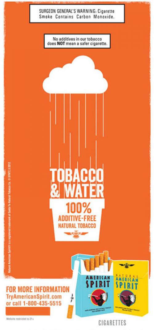 Half page, orange colored ad promoting American Spirit cigarettes as being 100% additive-free and the product of only "Tobacco & Water." The ad prompts the reader to call or visit the brand website for more information.